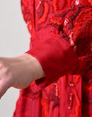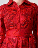 Drape yourself in timeless elegance with this scarlet red gown, featuring exquisite floral silk thread embroidery, a belted waist, and sheer puff sleeves