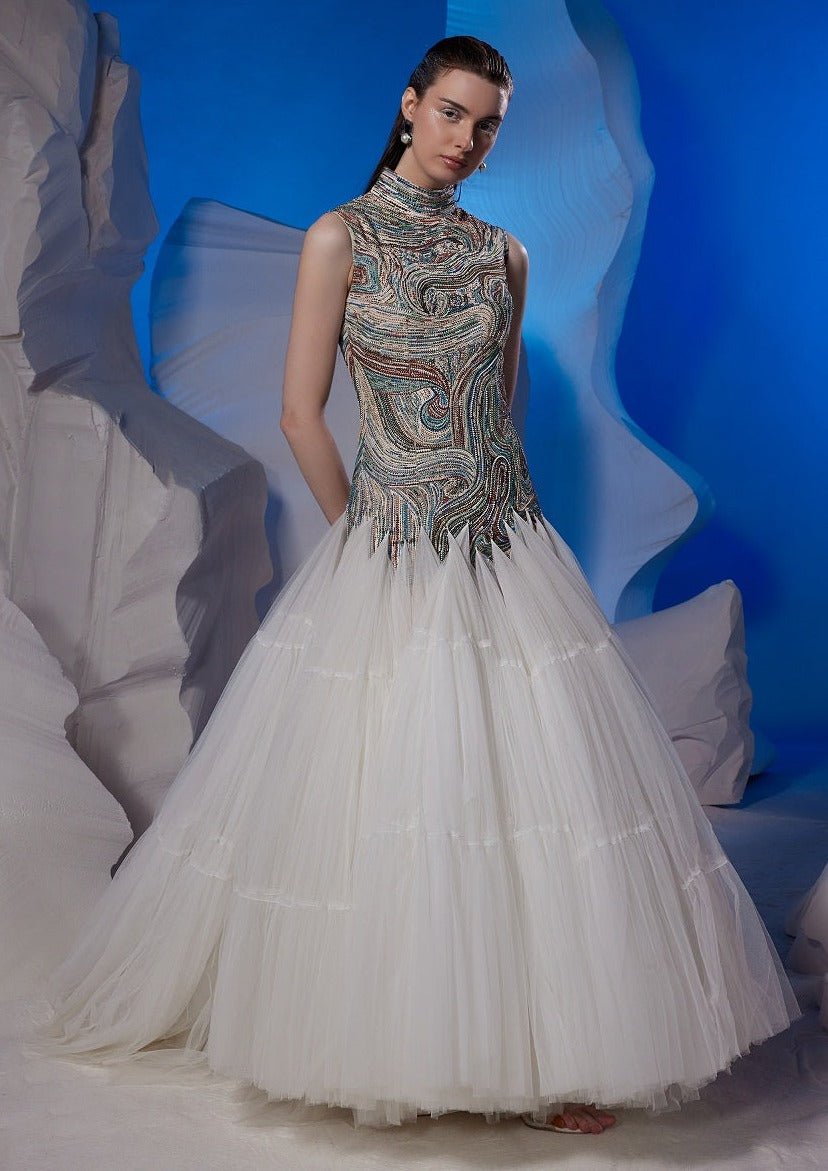 Elegant ivory floor-length gown featuring a high neckline in delicate net fabric, adorned with intricate silk thread and Zardozi embroidery.