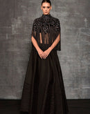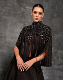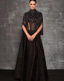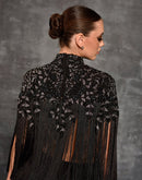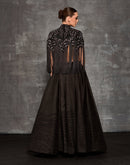 Chic black top adorned by silver and pearl embroidery and tassels, paired with a skirt featuring delicate grey silk thread embroidery.