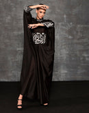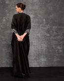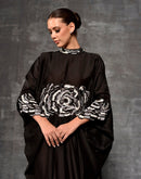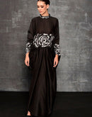 Black cowl dress adorned with vibrant embroidery at the waist, effortlessly combining modern flair with detailing on waist