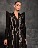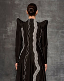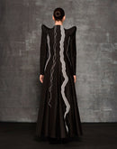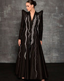 Stunning black floor-length gown with a lapel neckline, front open design, with cotton silk fabric, enhanced with exquisite silk thread and Zardozi embroidery.