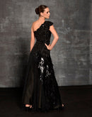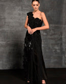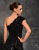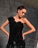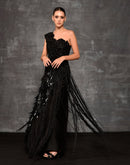 Elegant black one-shoulder gown adorned with exquisite Zardozi embroidery.
