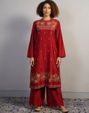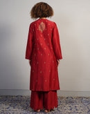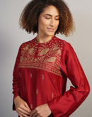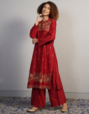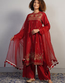 A gorgeous deep red cotton silk suit set in zero neck, showcasing rich Aari work in golden silk yarn. The pants are scalloped at the hem along with the borders of the organza Dupatta. Little latkans and lace on the Dupatta add to the beauty.