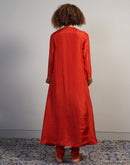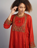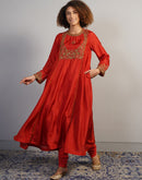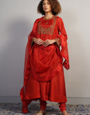 A rich looking, zero neck silk suit set in red that is intricately hand embroidered in zardosi. Adding to the beauty is the matching organza Dupatta that has frills to the borders. The ensemble has a cotton churidar.