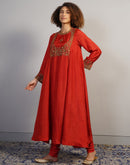A rich looking, zero neck silk suit set in red that is intricately hand embroidered in zardozi