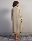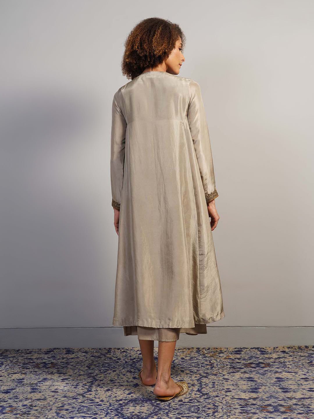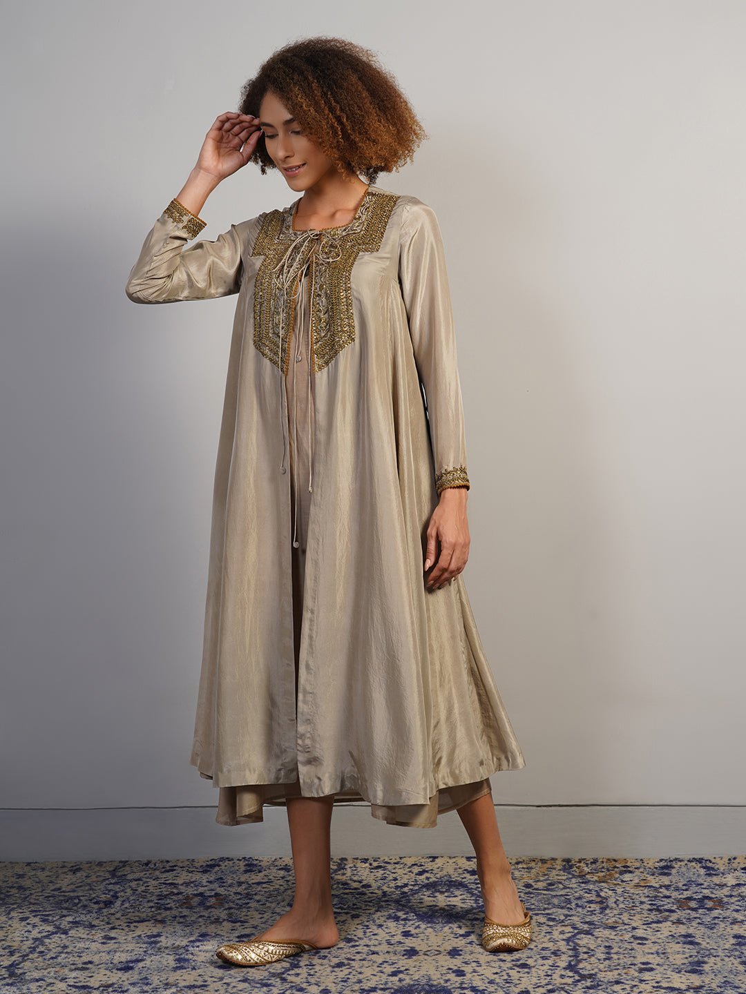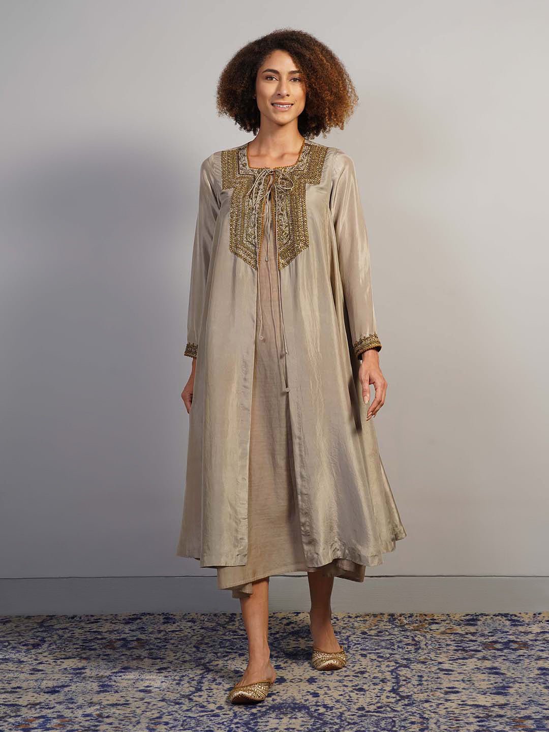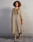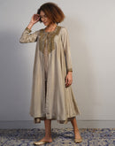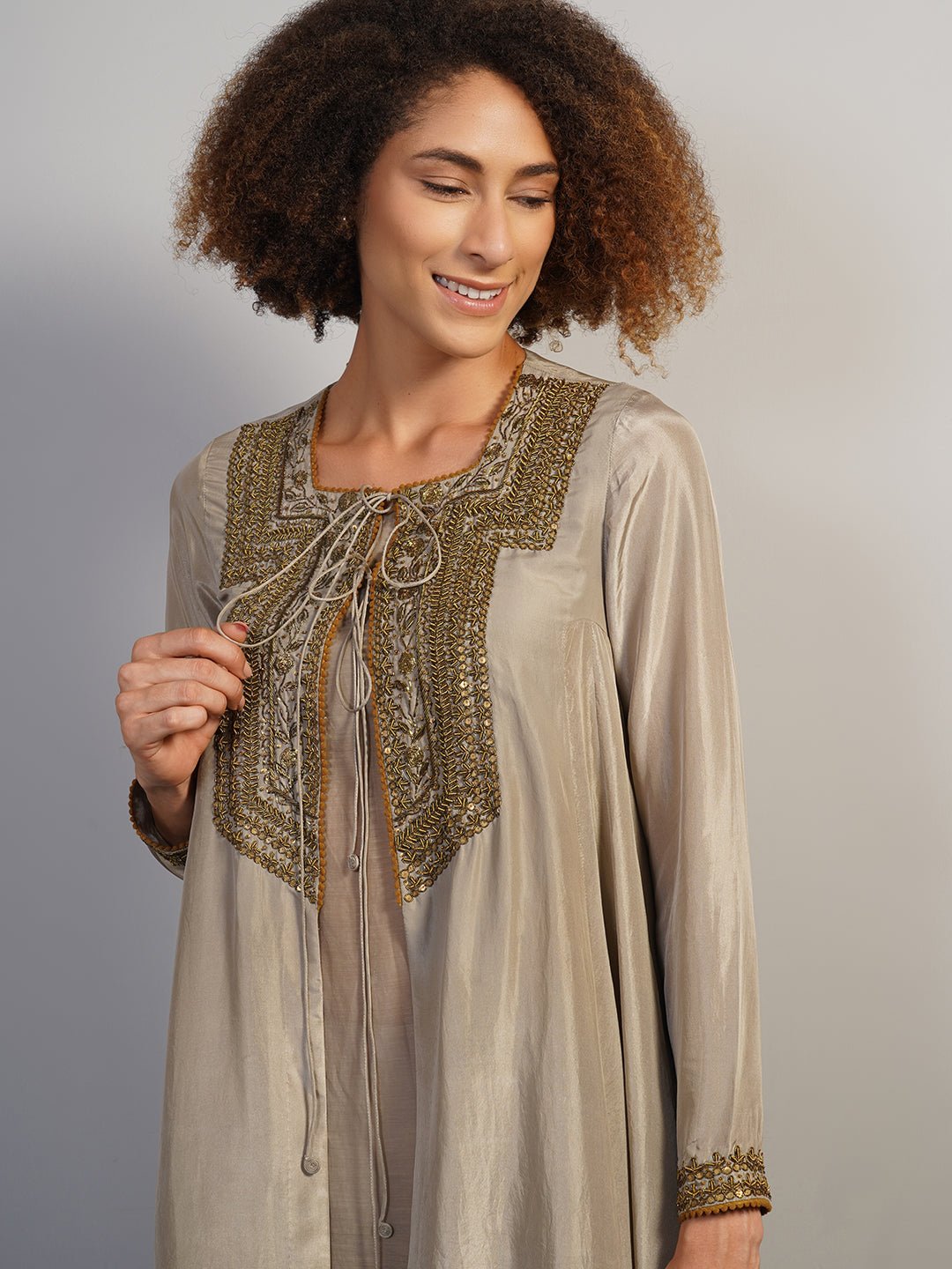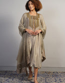 A warm grey silk suit set that is open in the front and secured with a knot at the squared neckline. The kurta is paired with a cotton churidar and adorned with a matching organza Dupatta that has frills on the borders. The intricate zardosi hand embroidered adds to the beauty.