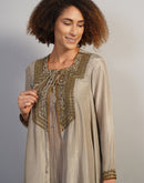 A warm grey silk suit set that is open in the front and secured with a knot at the squared neckline