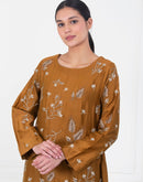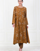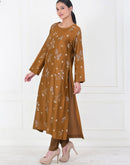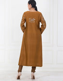 A brown cotton silk kurta that is embroidered in the front and is paired with cotton churidar.