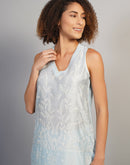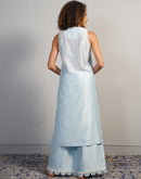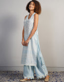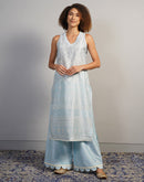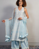 A V-neck, powder blue cotton silk suit set that is decorated subtly in aari work embroidery in white silk yarn. It is paired with a matching organza Dupatta that has cotton silk frill and white lace on the border.