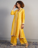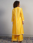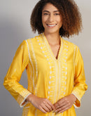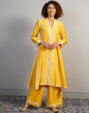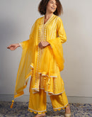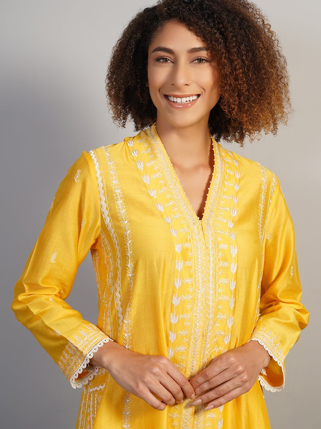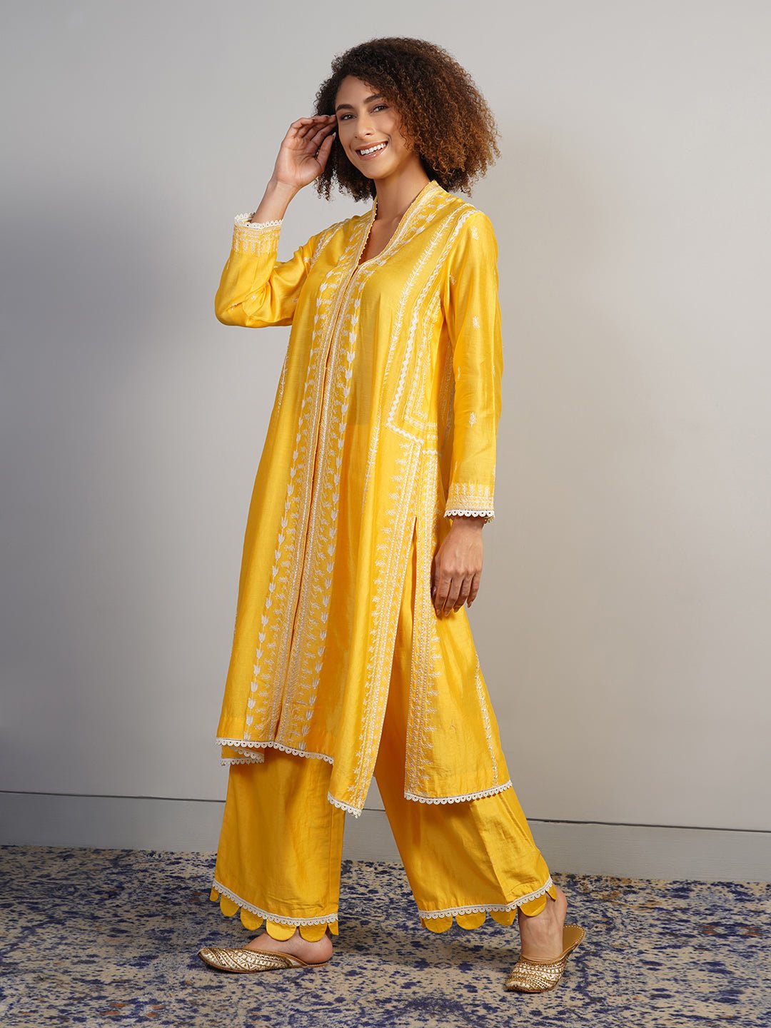 A beautiful V-neck, front open (secured with hooks) sunshine yellow cotton silk suit set adorned with intricate Aari embroidery in white silk yarn along with an organza Dupatta that has a lacy border and Lankans. The scalloped hem of pants add to the beauty.