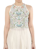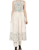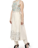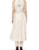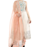An off white chanderi silk embroidered kurta with two front slits along with cigarette pants and peach organza dupatta