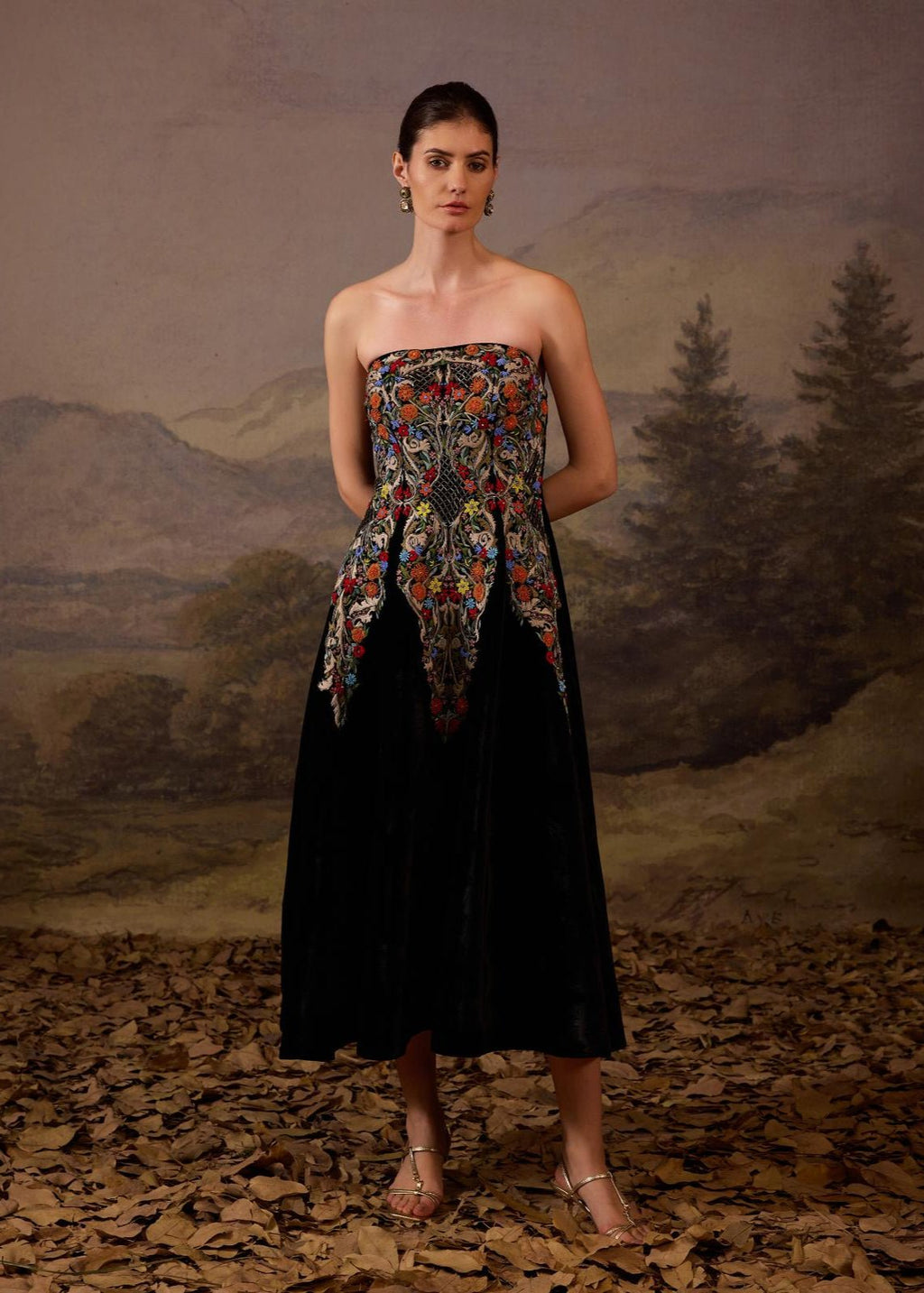 Chic black strapless dress with a richly embroidered bodice and a flowing midi skirt. An ideal choice for making a sophisticated colorful embroidery