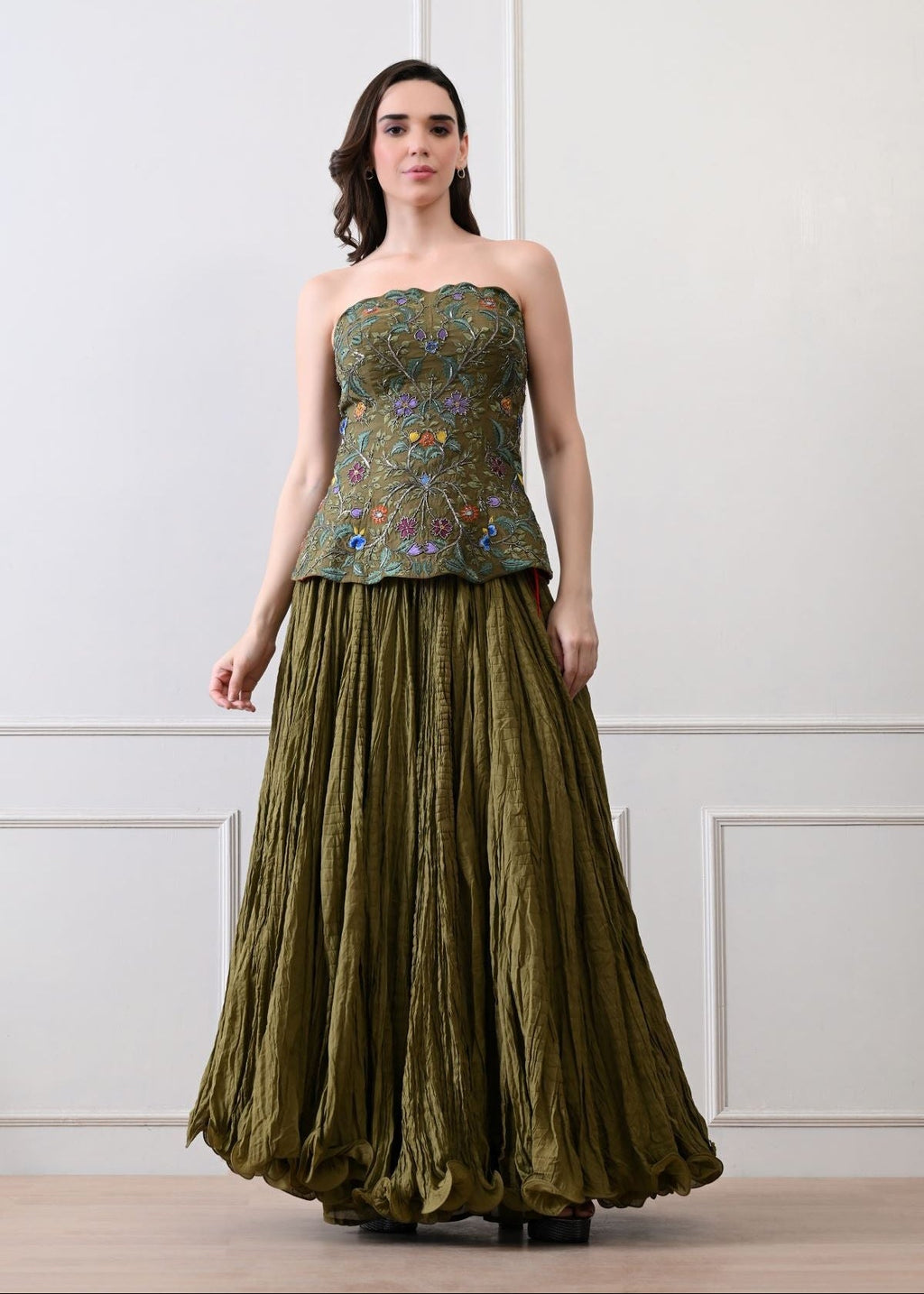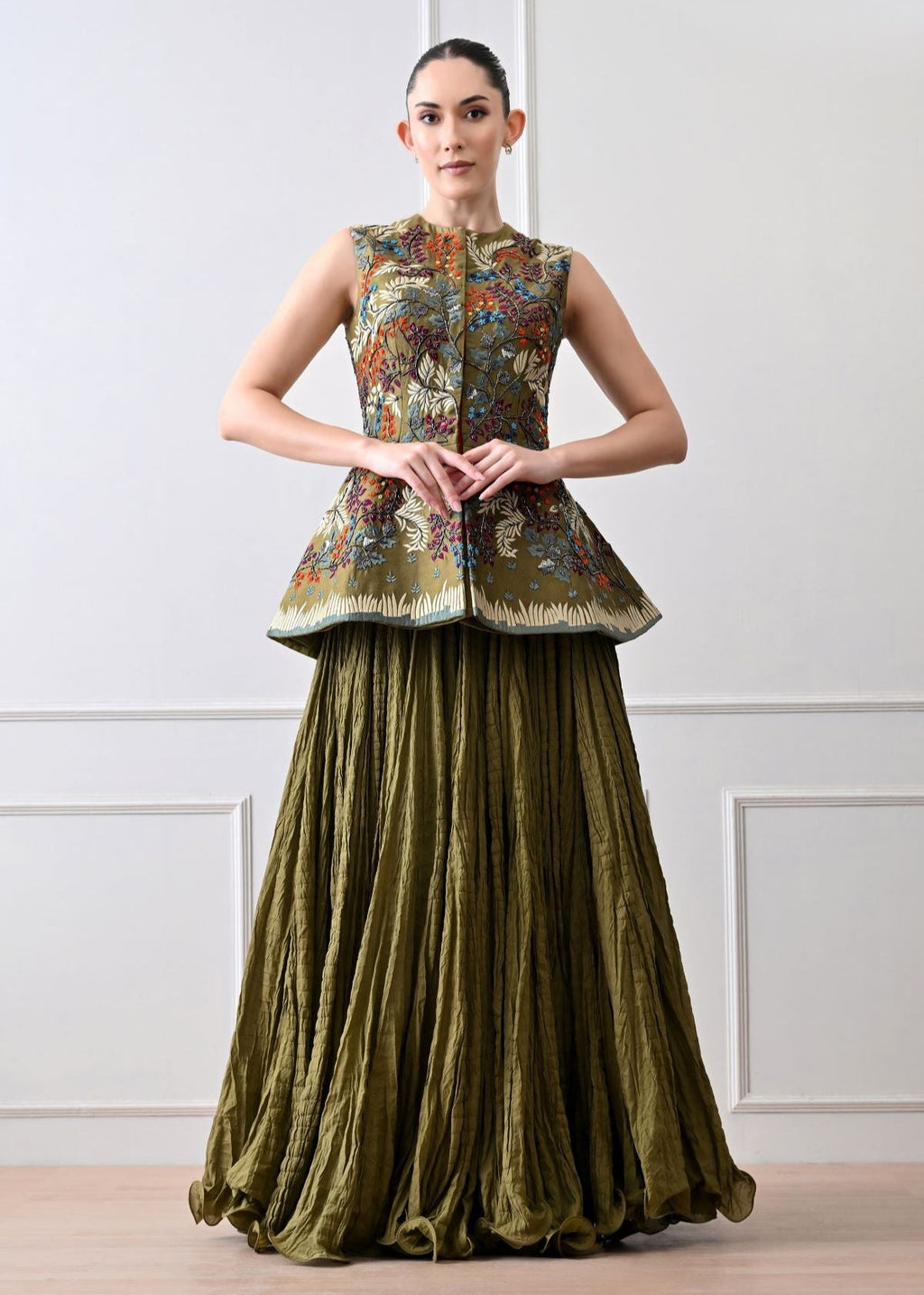 Make a statement with this exquisite olive sleeveless peplum jacket, intricately adorned with vibrant floral and botanical embroidery. Paired effortlessly with cruss cotton skirt