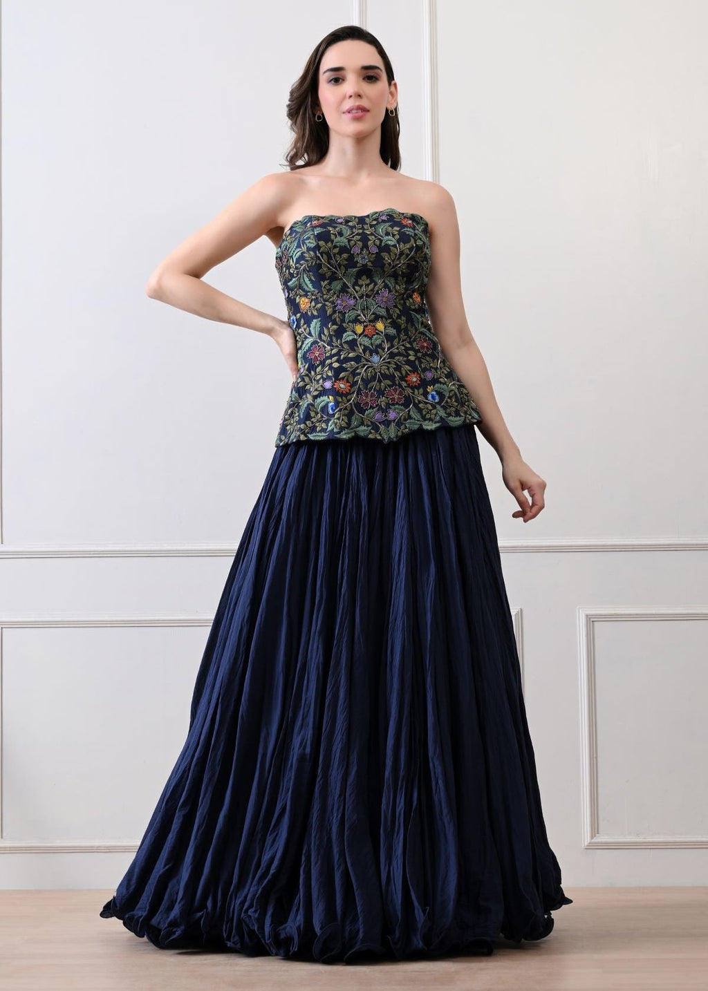 Stunning blue strapless top with beautiful all-over floral embroidery and a flattering peplum hem. A chic and contemporary choice when teamed with cruss cotton skirt