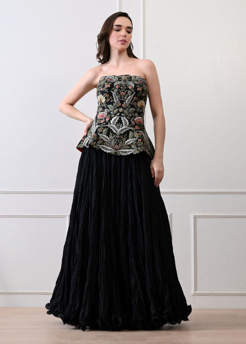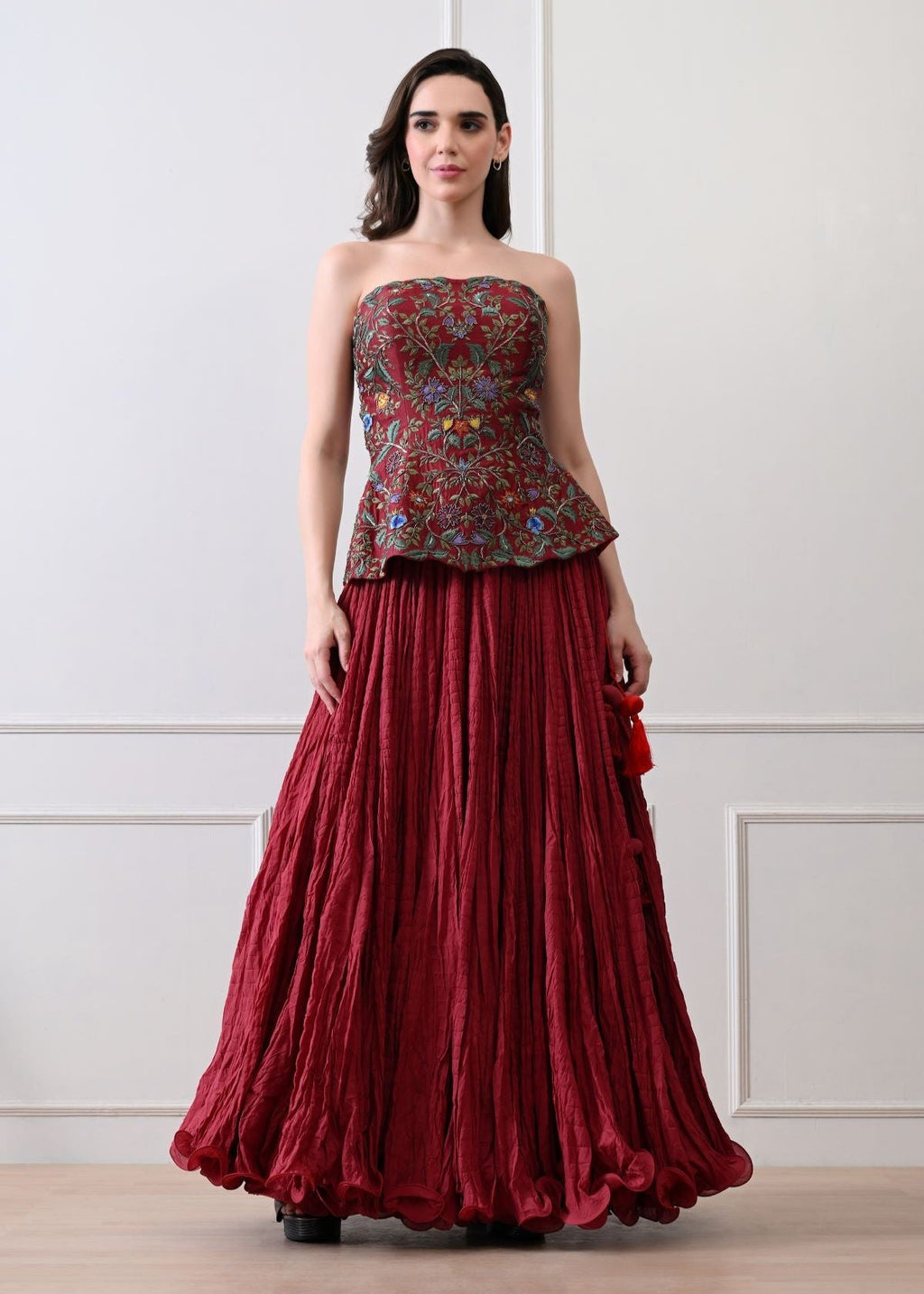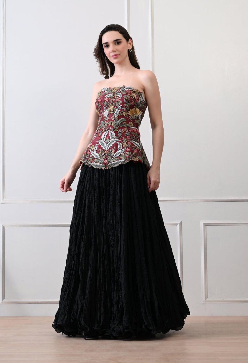 Crafted in lustrous Chanderi with a soft cotton lining, the Merlot Bloom Corset Set pairs a strapless corset with a graceful skirt in rich black and deep maroon tones. The bodice features intricate floral embroidery in fine sil...