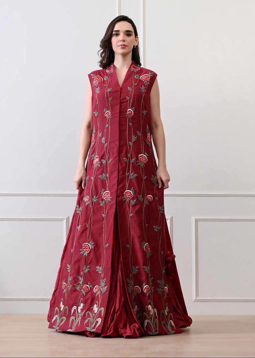 A beautiful long maroon anarkali featuring delicate floral embroidery across the chest,