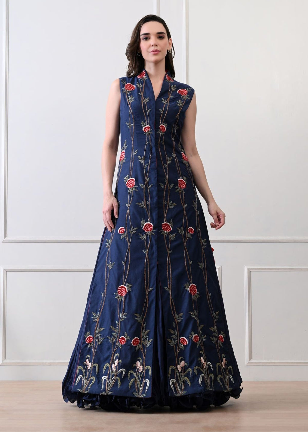 Crafted from luxurious blue Chanderi and lined with soft cotton, this Anarkali radiates heritage charm with a touch of modern sophistication. The bodice is adorned with intricate floral motifs, meticulously hand-embroidered in ...