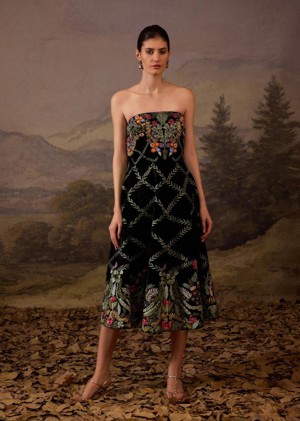 This strapless black midi dress is a stunning blend of elegance and craftsmanship. The bodice is adorned with vivid floral embroidery in shades multicolor on velvet base fabric