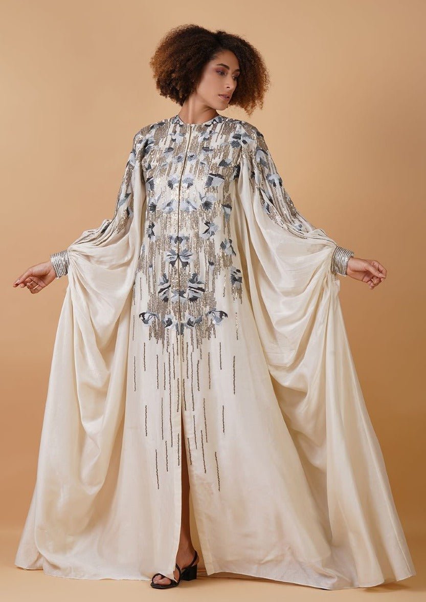 A white cotton silk kaftan dress with zero neck, beautifully embroidered top and cowls added to the sleeves..