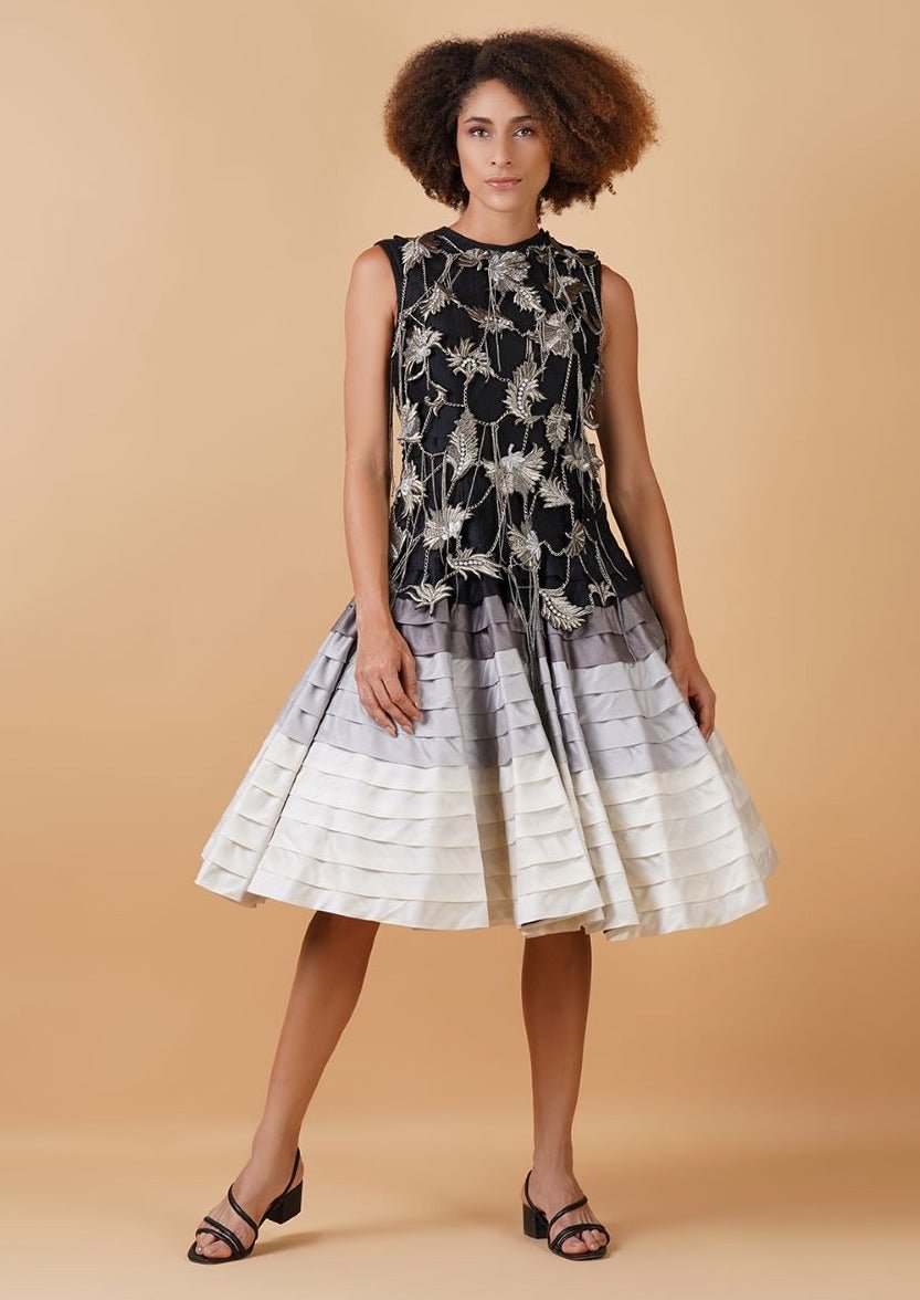 An A-line, knee-length dress made in cotton silk. The skirt is sewed in a way to add texture and showcases a gradient of black to white in layers. The top of the dress is beautifully embroidered in silver zari.