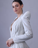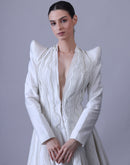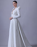 Stunning ivory floor-length gown with a lapel neckline, front open design, and cotton silk fabric, enhanced with exquisite silk thread and Zardozi embroidery.