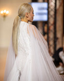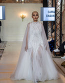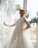 Radiate elegance in this ethereal white gown, featuring intricate beadwork on a fitted bodice and a flowing sheer cape overlay. The floor-length tulle skirt adds volume and grace