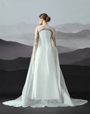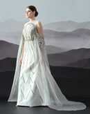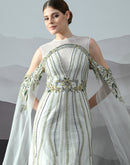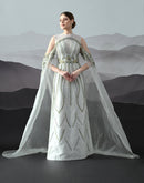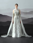 A softly structured gown detailed with rhythmic embroidered patterns and sheer cascading layers, expressing balance through precision and fluidity.