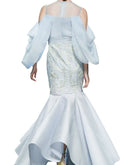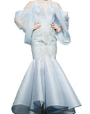 Ice Blue fit & flare off-shoulder mermaid gown embroidered in floral motifs of silk & zari yarn.
