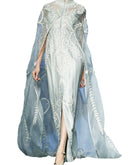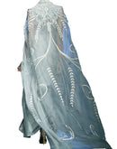 Ice Blue front-opening collar attached embroidered trail chanderi & organza dress.