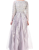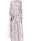 Icy lilac fit & flare asymmetric flowy organza gown embroidered motifs in silk & zari yarn.
