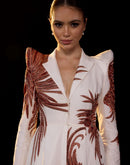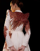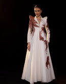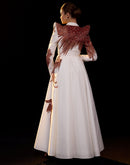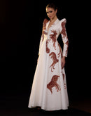 An elegant fusion of structure and drama, this ivory full-length gown features a sharp collared neckline, structured shoulders, and bold rust-toned embroidery