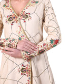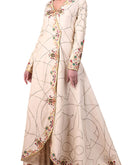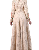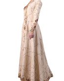 Beige overlap V-neckline, fit & flare front opening asymmetric hemline Cotton Silk Gown embroidered in geometric & floral motifs of silk & zari yarn.