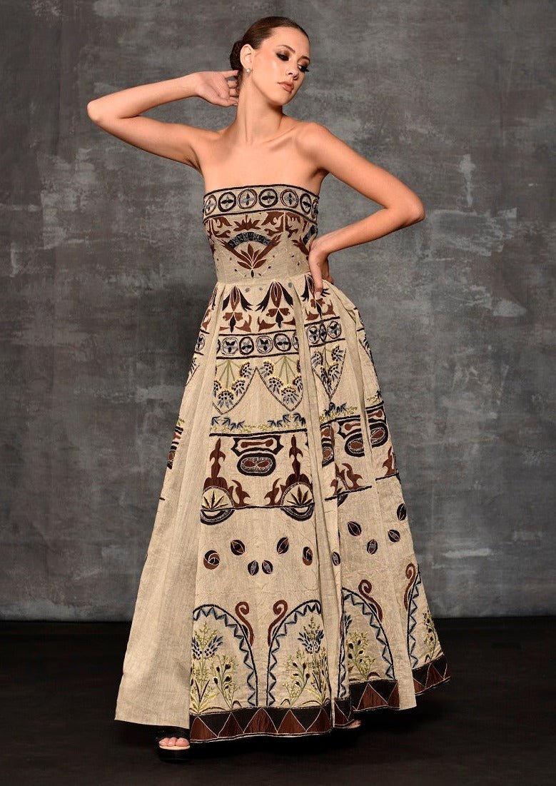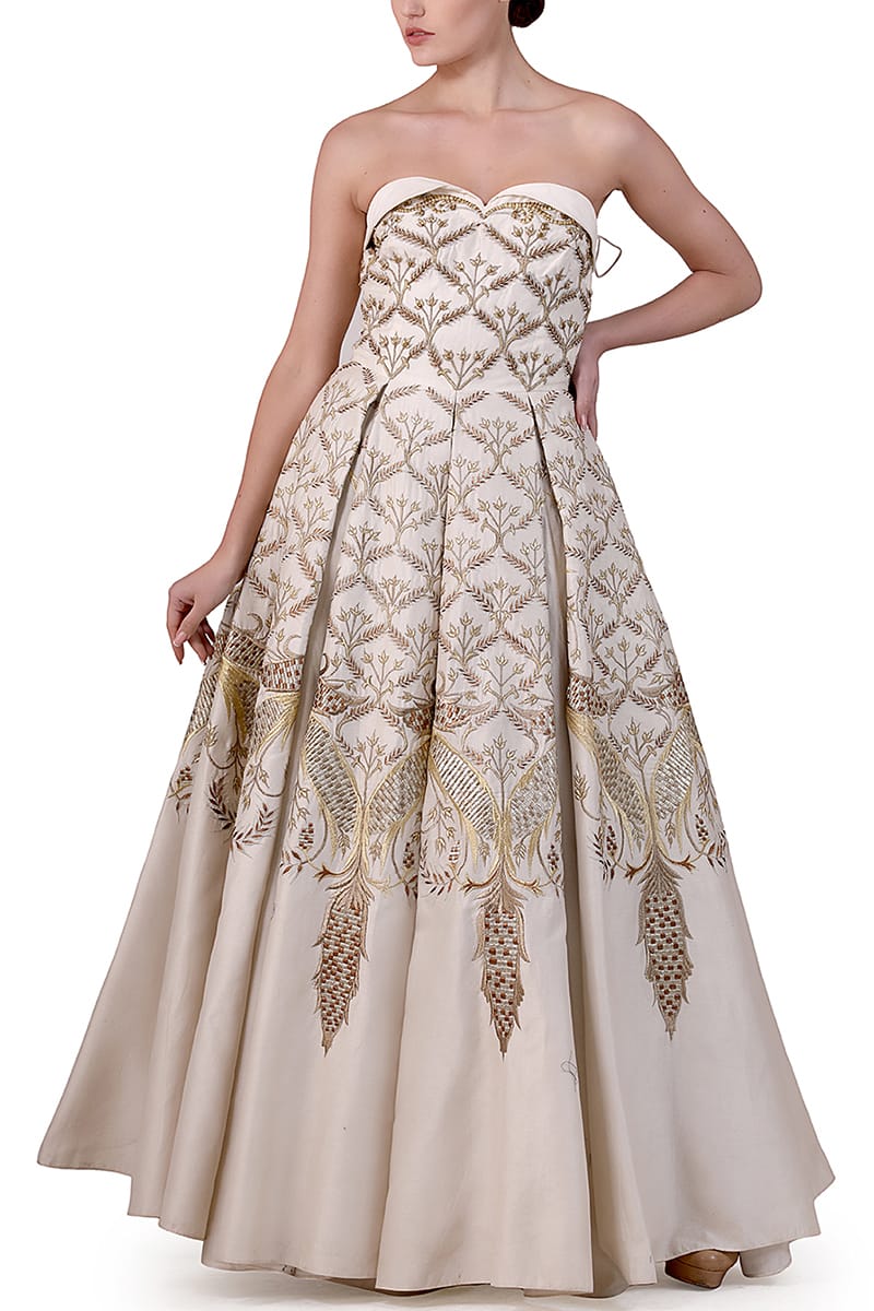 Fit & flare bustier gown highlighted in silk yarn, zari & applique work.Color: GreyFabric: Linen SilkCare Instructions: Dry Clean Only.