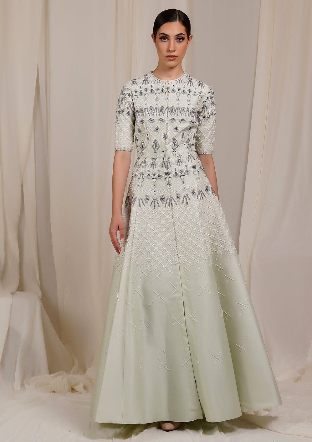 front-opening fit & flare embroidered chanderi gown.Color: Mint green Fabric: ChanderiCare Instructions: Dry Clean Only.