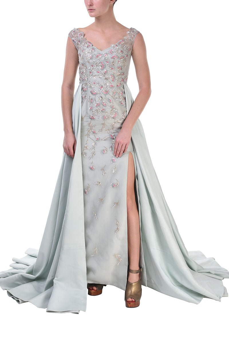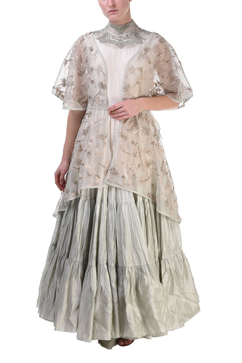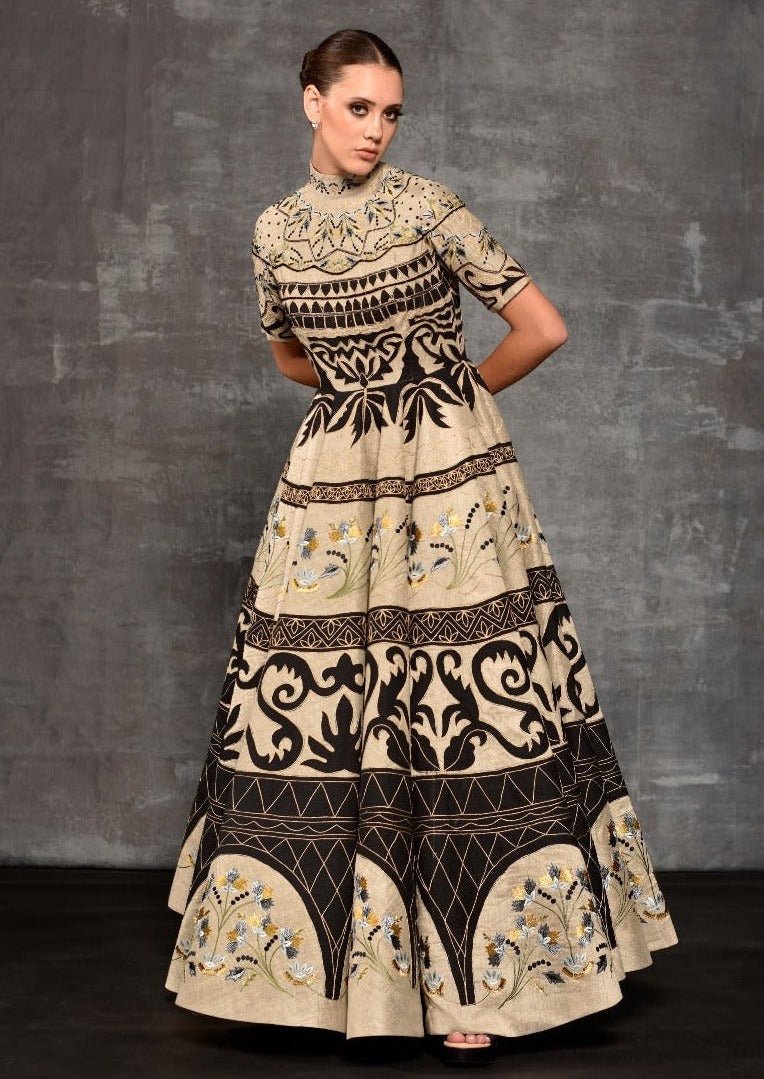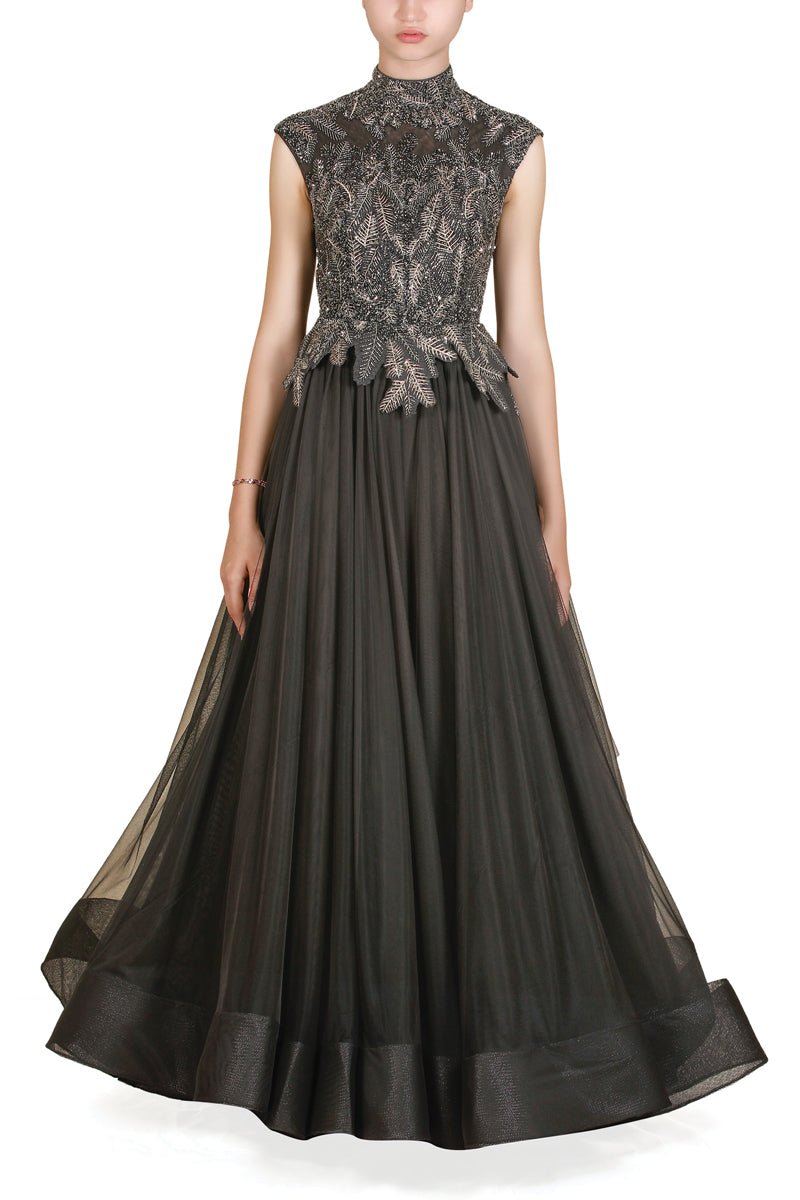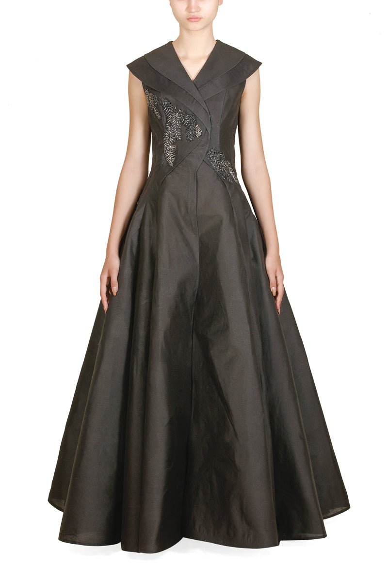 fit & flare high necked gown highlighted in applique work and embroidered in silk & zari yarn.Color: GreyFabric: Linen SilkCare Instructions: Dry Clean Only.
