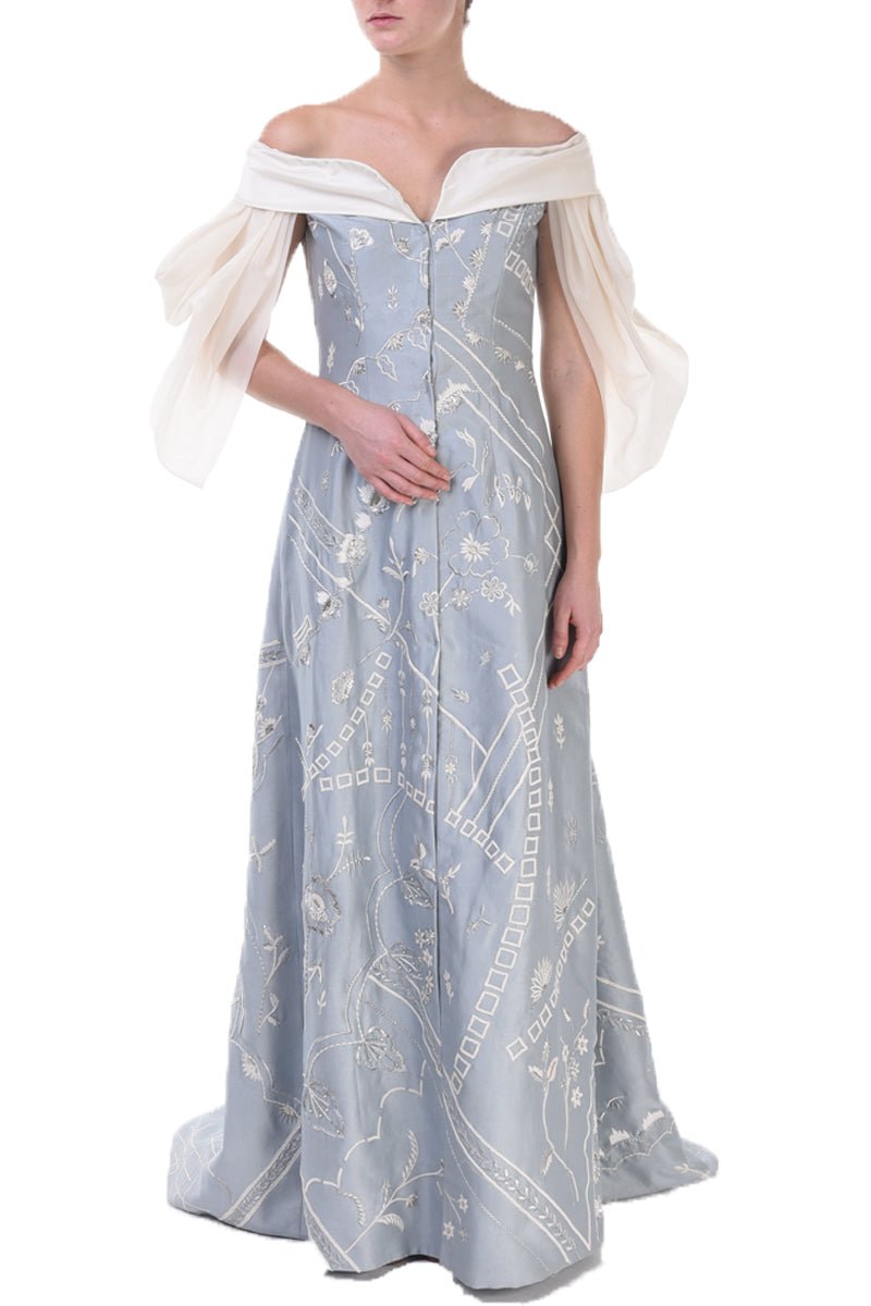 Blue cold-shoulder front-opening embroidered gown.Color: BlueFabric: Chanderi & OrganzaCare Instructions: Dry Clean Only.