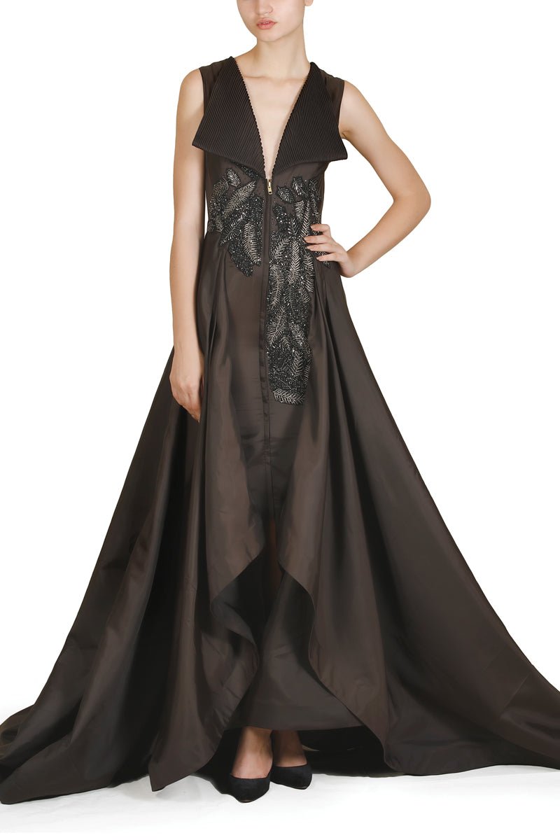 Black collared front zipper opening asymmetric hemline chanderi gown highlighted in sequins, beads & zari work.Color: BlackFabric: ChanderiCare Instructions: Dry Clean Only.