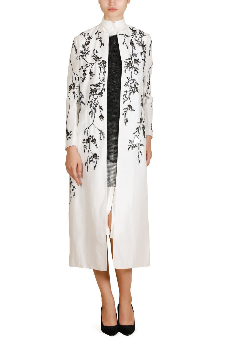 Ivory shirt dress layered with ivory chanderi front-zipper opening mandarin collared long jacket embroidered in silk & zari yarn.Color: Ivory & BlackFabric: ChanderiCare Instructions: Dry Clean Only.