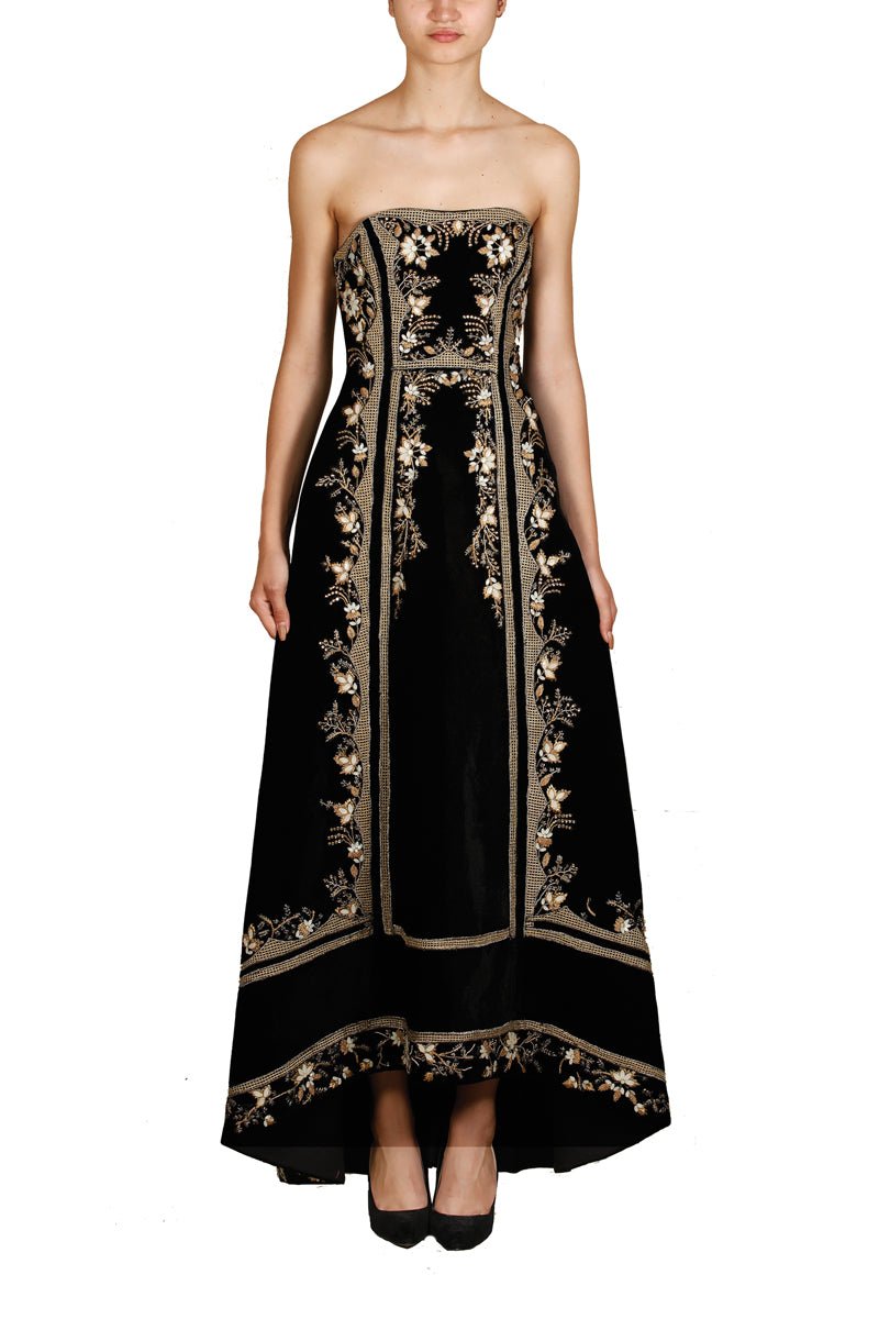 Black velvet bustier gown embroidered in zari, sequins, beads & dabka.Color: BlackFabric: VelvetCare Instructions: Dry Clean Only.