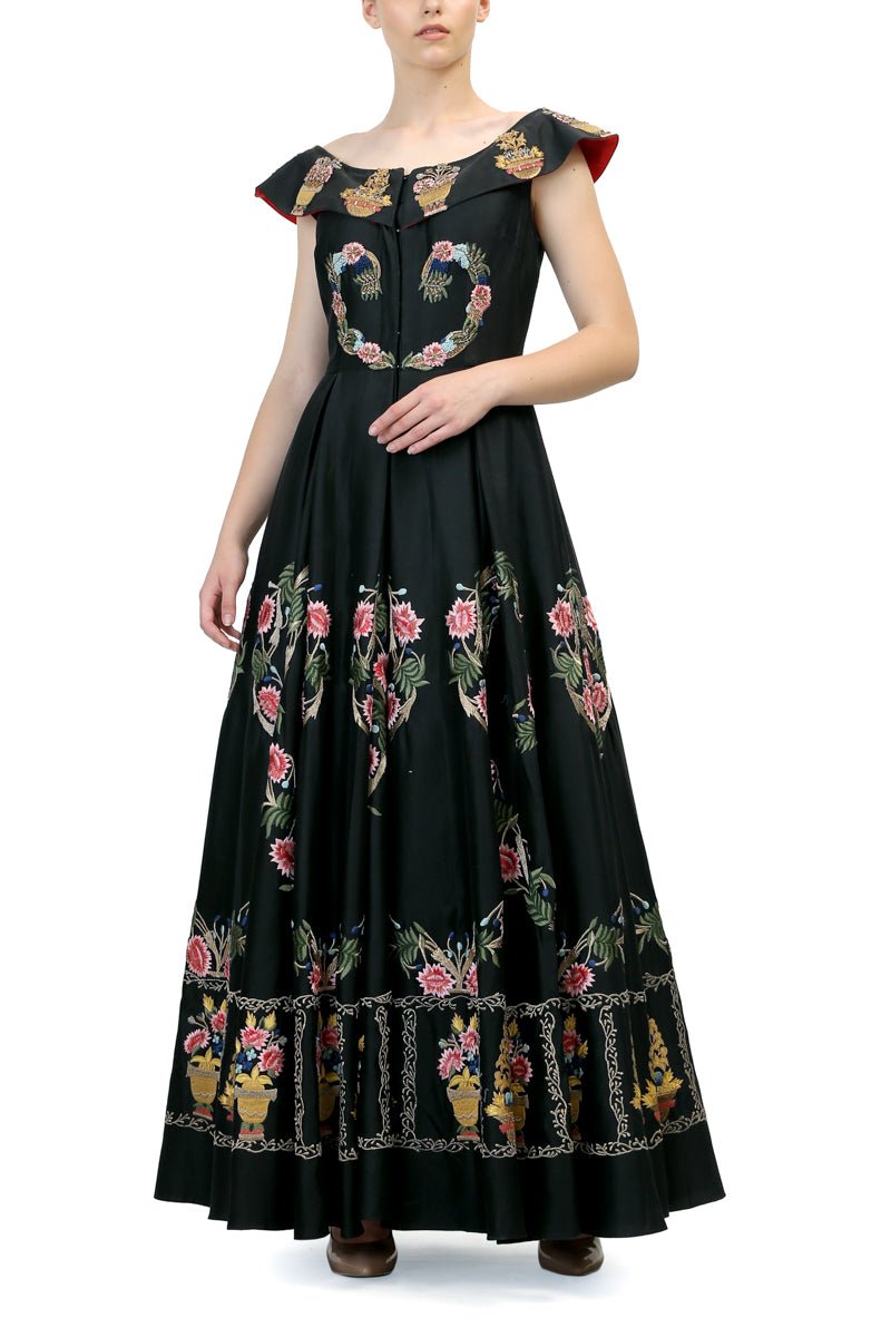 Featuring a black boat-neck floor-length cotton silk gown embroidery in floral motifs silk & zari yarn.Color: BlackFabric: Cotton SilkCare Instructions: Dry Clean Only.