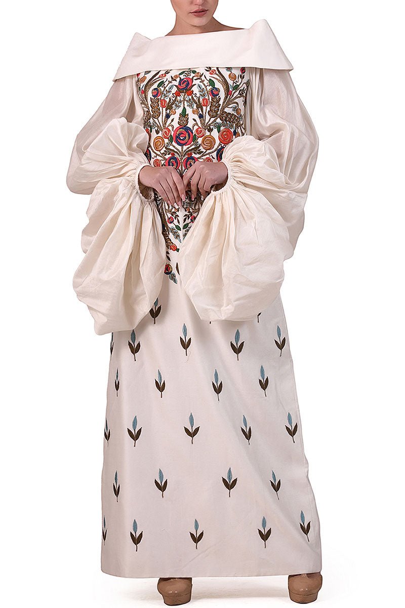 Ivory floor-length cotton silk dress with big balloon sleeves and stylized neck. The dress is embroidered floral motifs of silk yarn & zari work.Color: Ivory Fabric: Cotton SilkCare Instructions: Dry Clean Only.