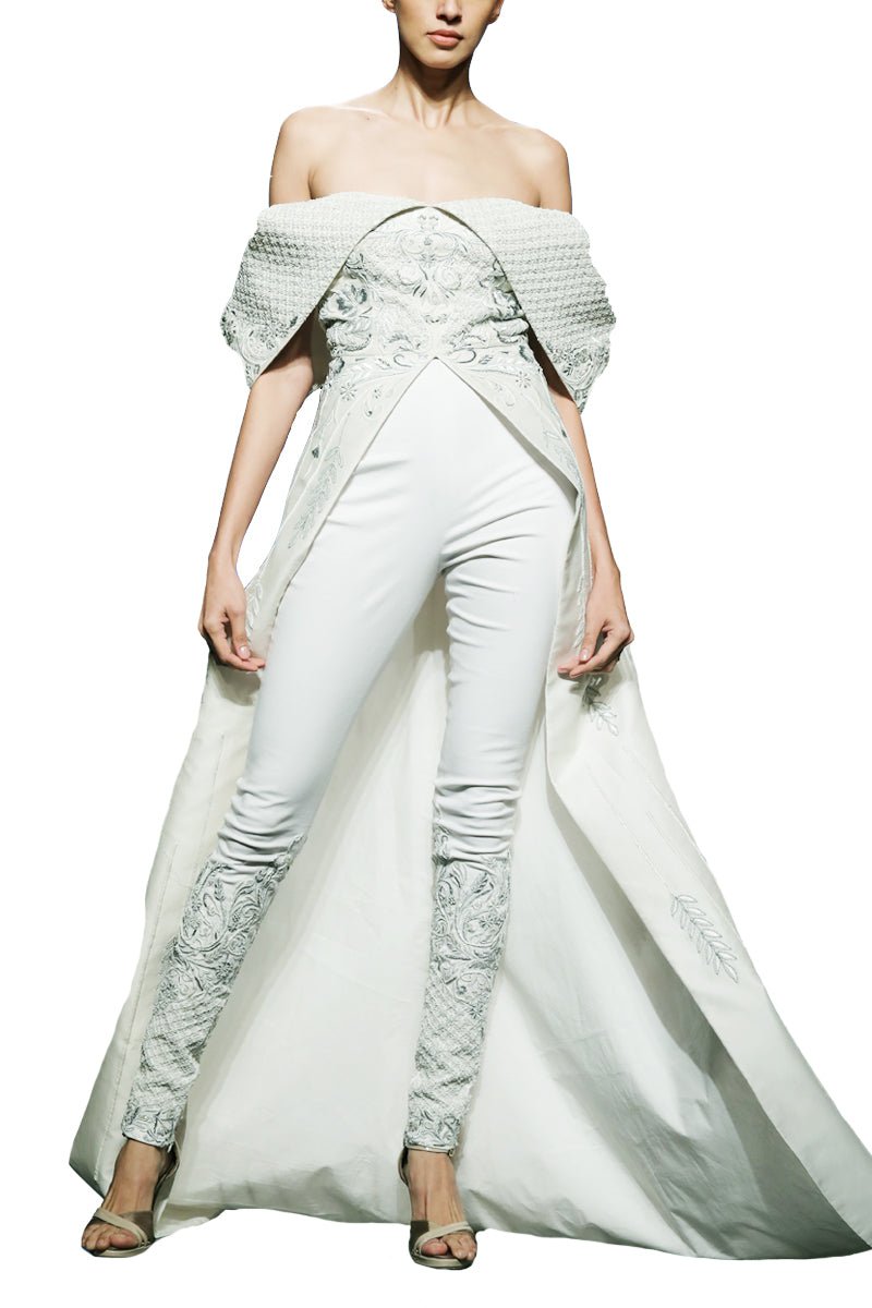 Ivory cold-shoulder front slit embroidered jacket & pants.Color: IvoryFabric: ChanderiCare Instructions: Dry Clean Only.