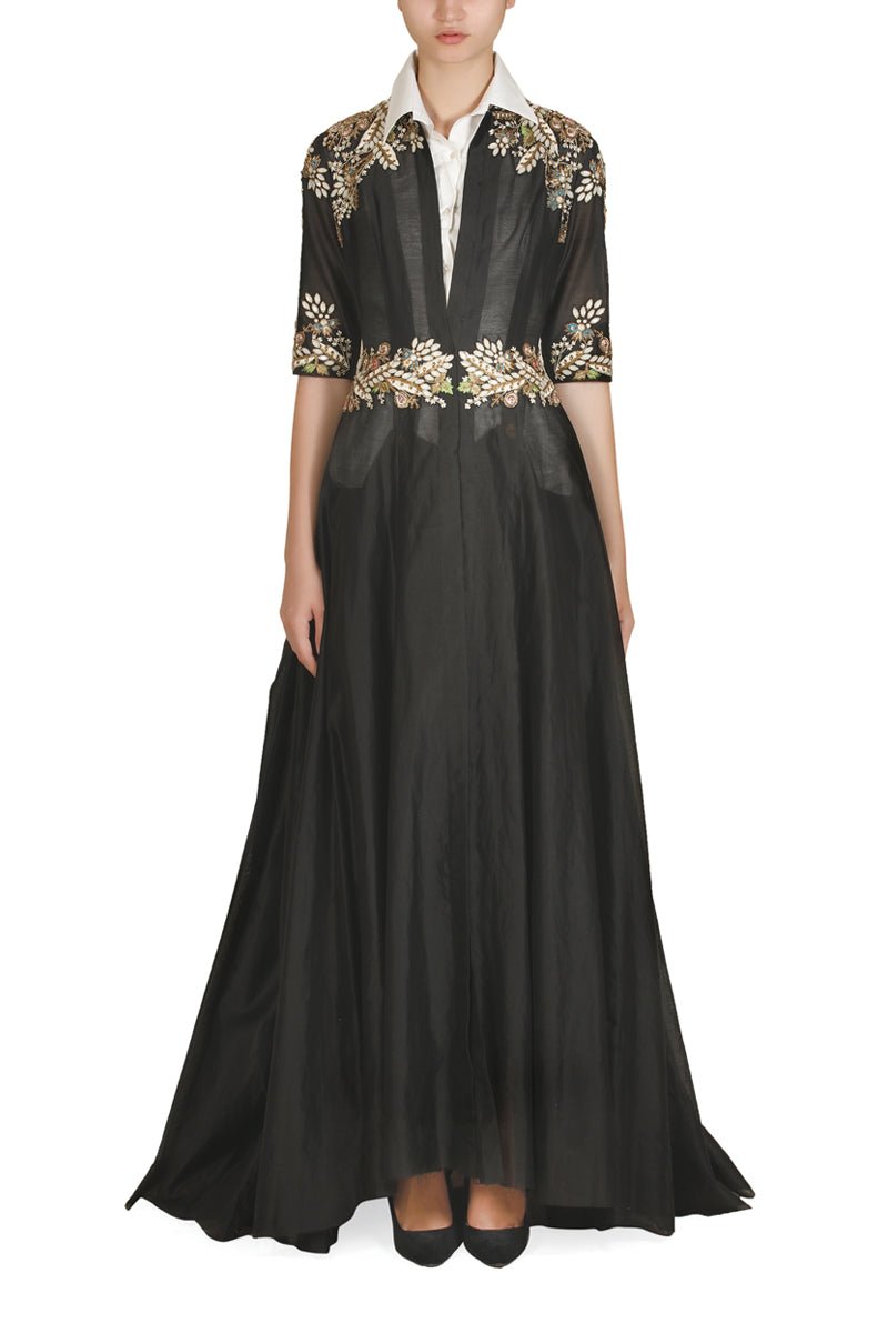 Black front-opening chanderi gown embroidered in silk yarn, sequins, beads & dabka.Color: BlackFabric: ChanderiCare Instructions: Dry Clean Only.