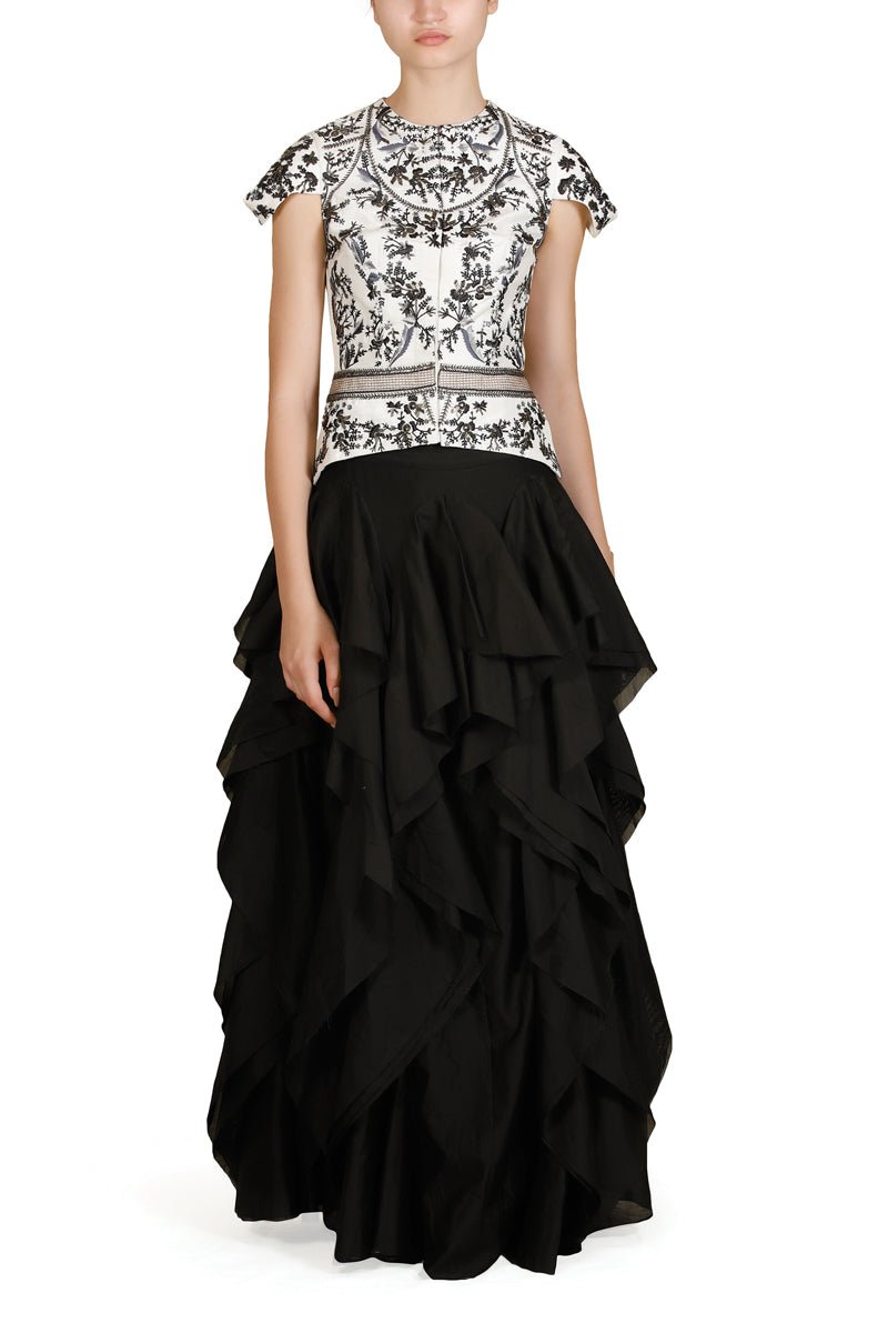 Ivory cap sleeves chanderi jacket blouse embroidered in silk yarn, beads & zari, paired with a black ruffle skirt.Color: Ivory & BlackFabric: ChanderiCare Instructions: Dry Clean Only.