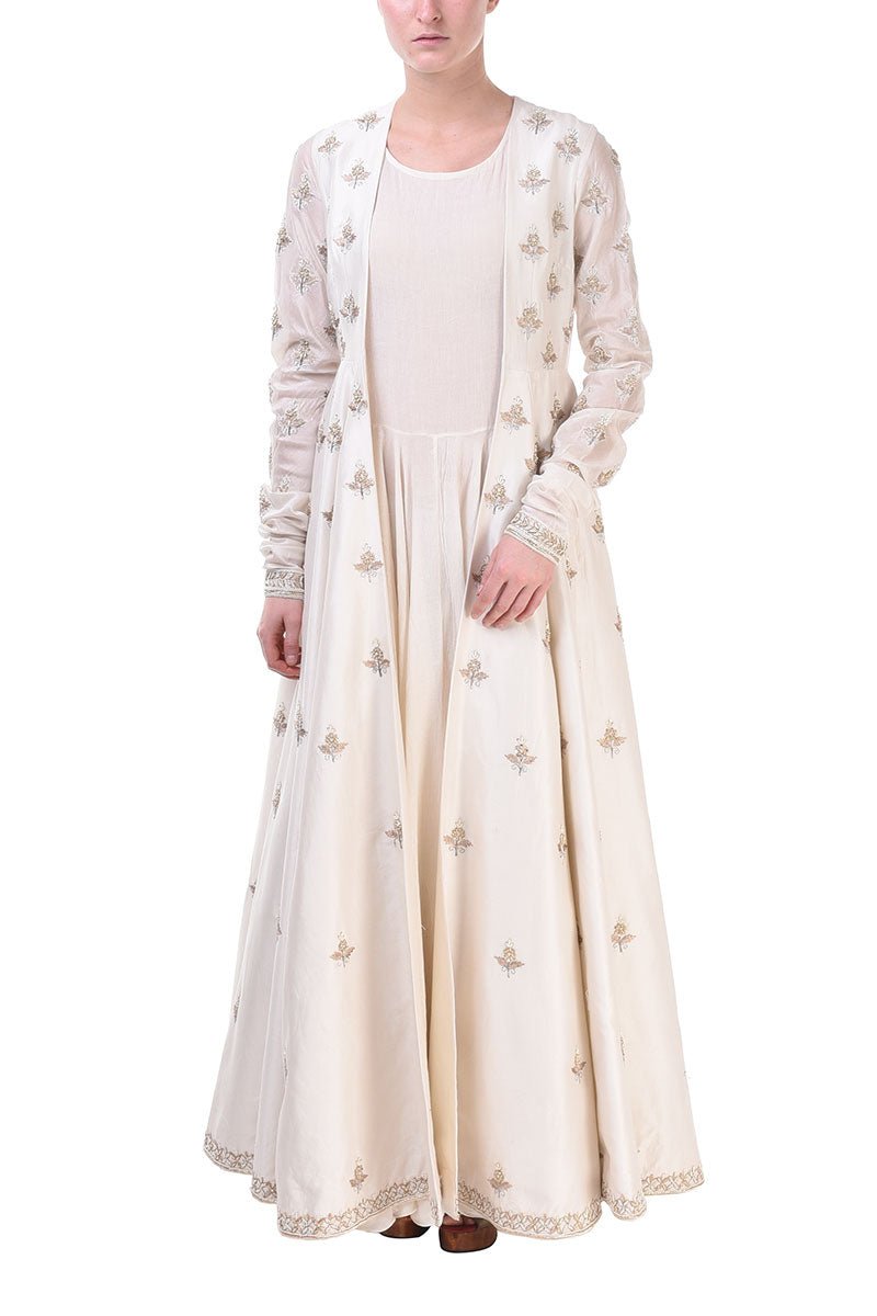 Ivory front-opening embroidered chanderi long jacket with cotton inner long slip dress.Color: IvoryFabric: ChanderiCare Instructions: Dry Clean Only.