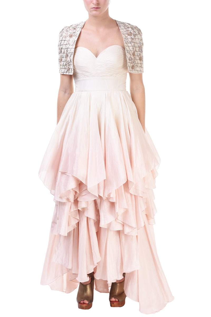 Rose Pink bustier fit & flare paneled asymmetric tiered gown layered with a short embroidered jacket.Color: Rose PinkFabric: ChanderiCare Instructions: Dry Clean Only.