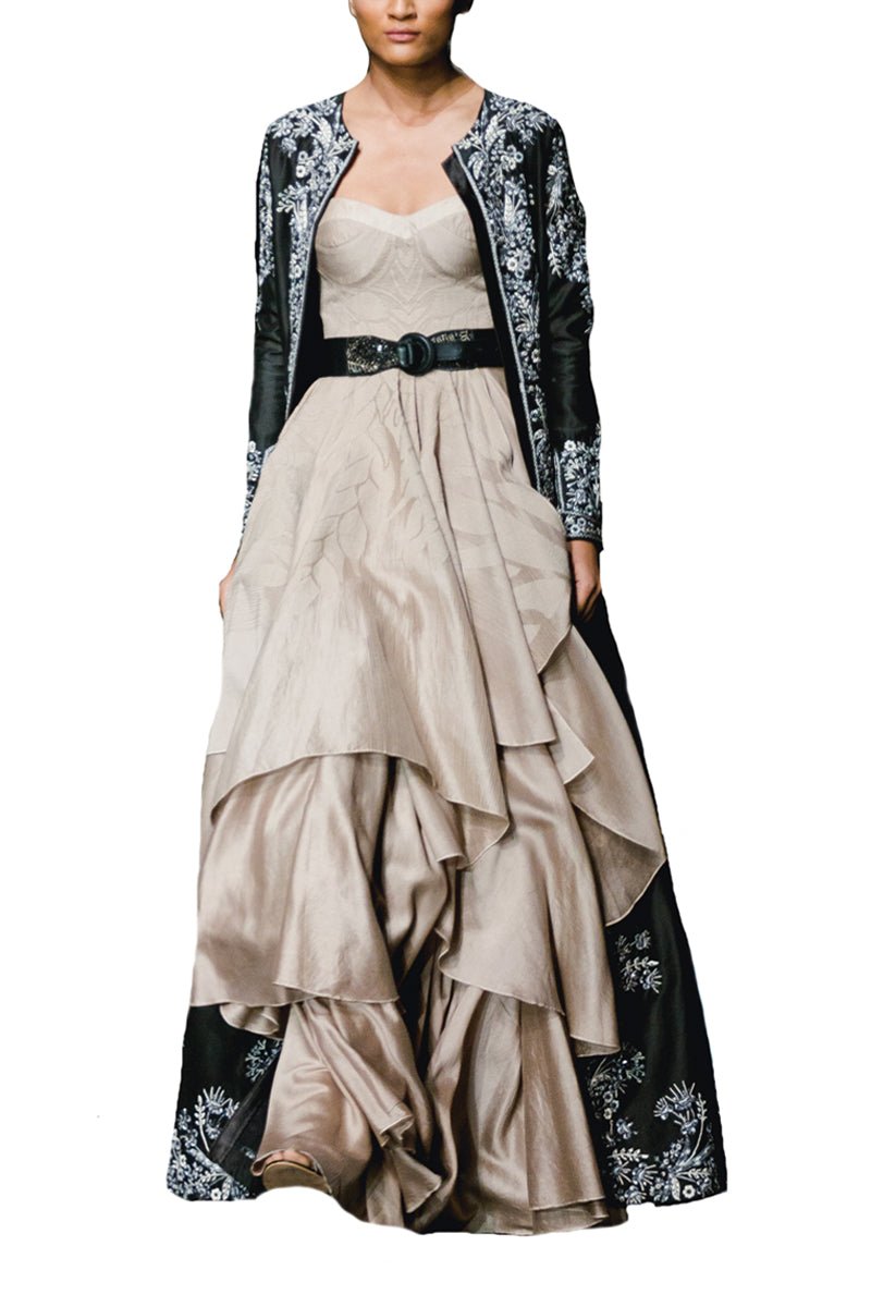 Beige patch-worked bustier asymmetric hemline gown layered with a black long jacket embroidered in silk & zari yarn.Color: Cement Grey & BlackFabric: ChanderiCare Instructions: Dry Clean Only.