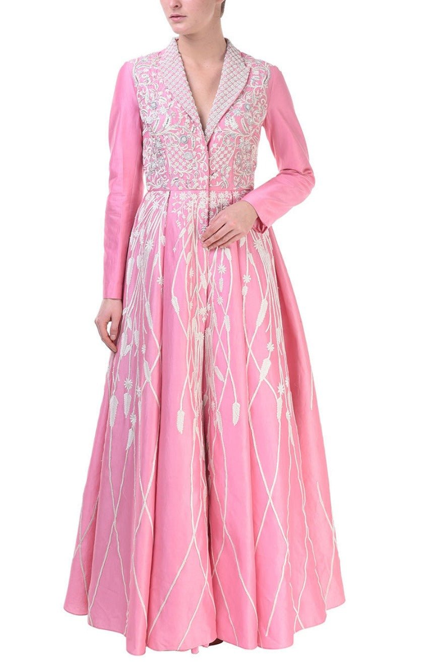 Pink front-opening fit & flare pleated embroidered jacket gown.Color: PinkFabric: ChanderiCare Instructions: Dry Clean Only.