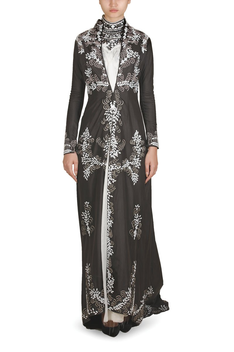 White gathered slip dress layered with a black front closure long chanderi jacket embroidered in zari, dabka & beads.Color: BlackFabric: ChanderiCare Instructions: Dry Clean Only.