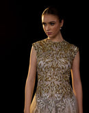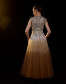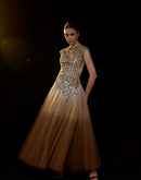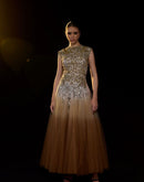 A stunning ombré tulle gown featuring intricate gold and silver leaf embroidery on the bodice. The soft gradient skirt flows effortlessly, blending elegance with contemporary flair—perfect for evening occasions or red-carpet moments.
